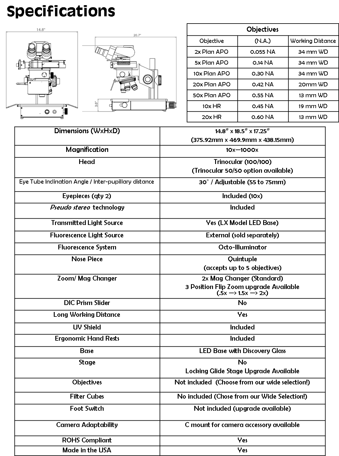 Unlike inferior microscopes, our FBS10 microscopes have an optional discreet zoom feature that allows for a quick flip from .5x to 2x zoom magnification. This is very similar to a linear zoom, without the associated standard light-loss. When not needed, this zoom system can be disengaged with the zoom optics removed from the light to better augment the light throughput.